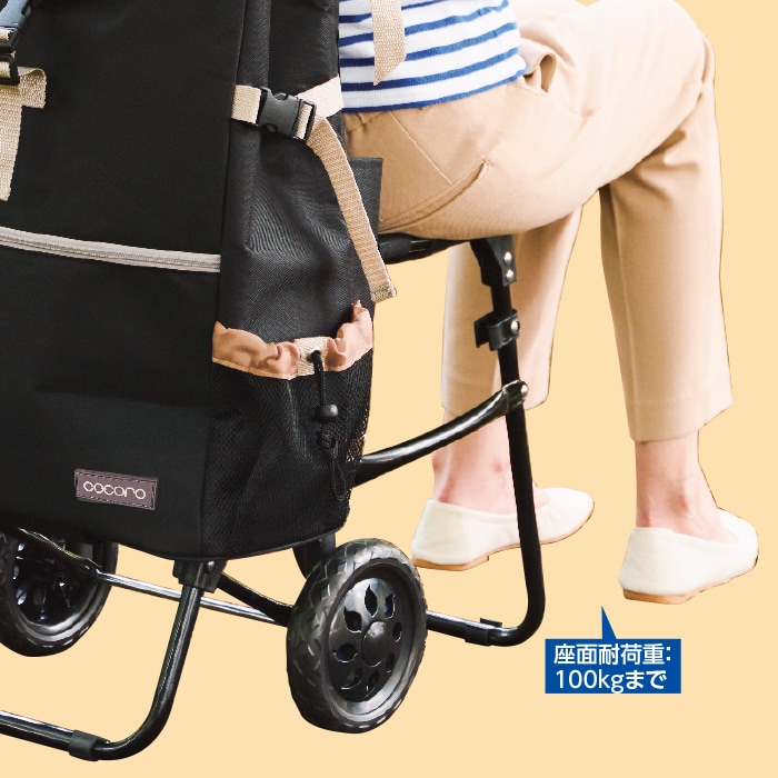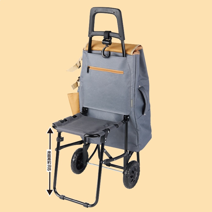 ◎材質/バッグ表地:ポリエステル100%、バッグ裏地/アルミ蒸着フィルム、座面部分表地/ポリエステル100%、クッション材/ウレタンフォーム、フレーム/スチール、タイヤ/EVA樹脂