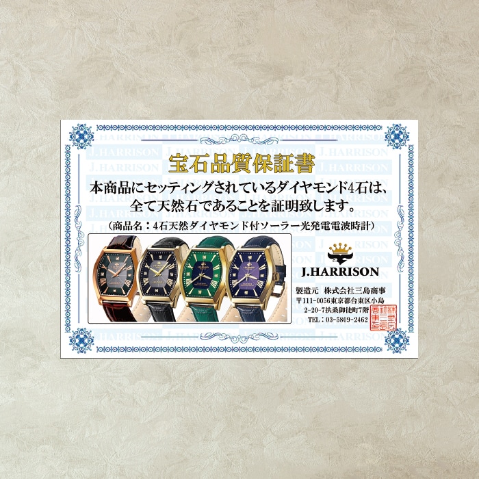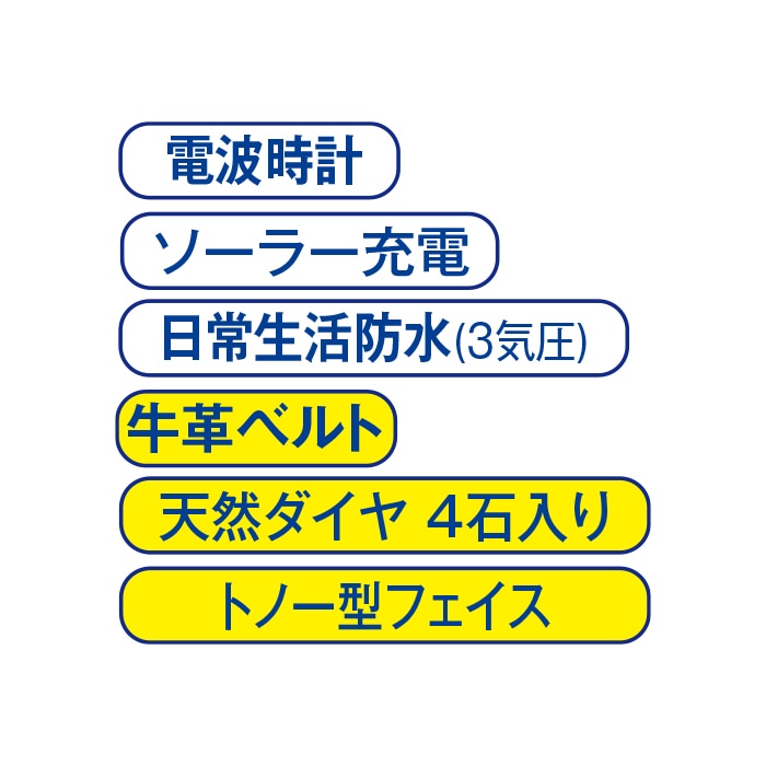 ◎仕様:日本製ソーラーパネル、中国製ムーブメント、光発電機能、電波受信機能、月差/±30秒(電波非受信時)、3気圧防水、品質保証書付、化粧箱付