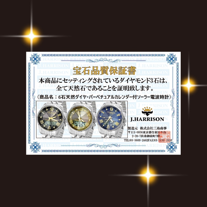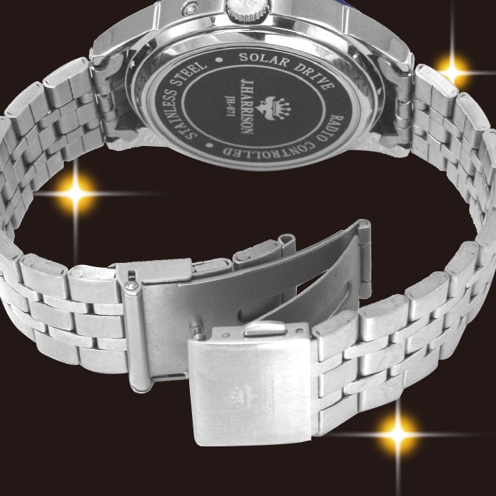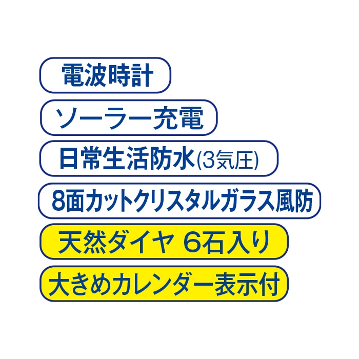 ◎仕様:日本製ソーラーパネル、中国製ムーブメント、光発電機能、電波受信機能、月差/±30秒(電波非受信時)、3気圧防水、品質保証書付、化粧箱付