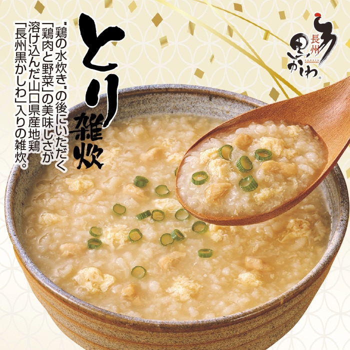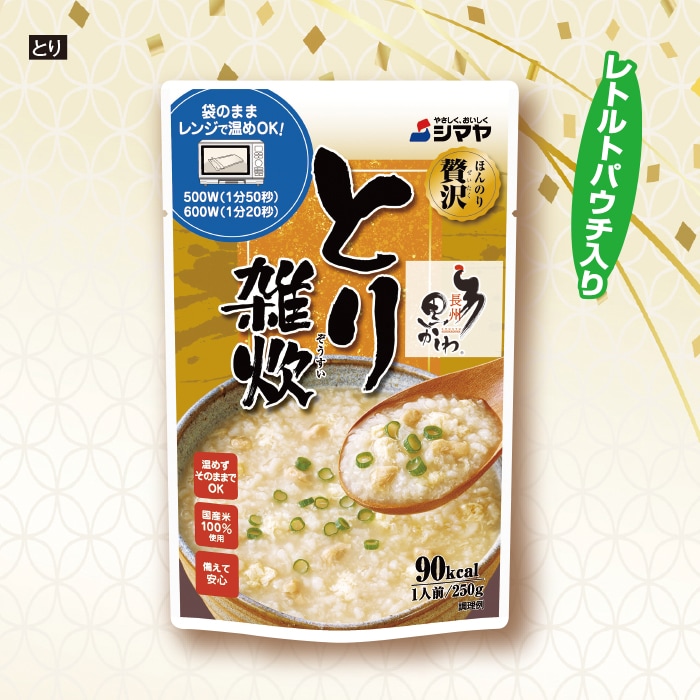 【とり雑炊】◎原材料:米(国内産)、鶏卵、鶏肉、鶏がらスープ、でん粉、チキンエキス、野菜エキス、食塩、たん白加水分解物、しいたけエキス粉末、こんぶ粉末、調味料(アミノ酸等)、(原材料の一部に小麦・大豆・豚肉・ゼラチンを含む) ◎加工地:日本