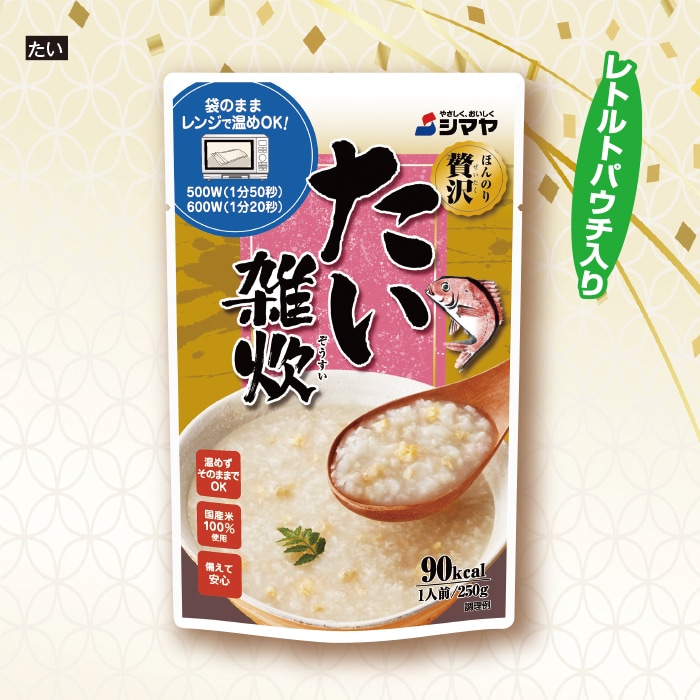 【たい雑炊】◎原材料:米(国内産)、鯛フレーク、鶏卵、鯛エキス、でん粉、食塩、たん白加水分解物、しょうゆ、こんぶ粉末/調味料(アミノ酸等)、(一部に卵・小麦・大豆・ゼラチンを含む) ◎加工地:日本