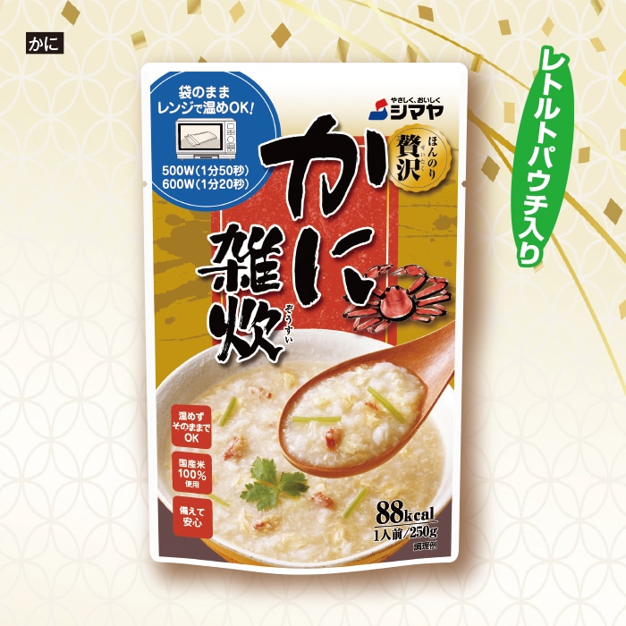 【かに雑炊】◎原材料:米(国内産)、鶏卵、ズワイガニフレーク、でん粉、カニミソエキス、カニエキス、しょうゆ、白菜エキス、食塩、たん白加水分解物、ネギエキス、しいたけエキス粉末、こんぶ粉末/調味料(アミノ酸等)、(一部に卵・小麦・かに・大豆・ゼラチンを含む) ◎加工地:日本