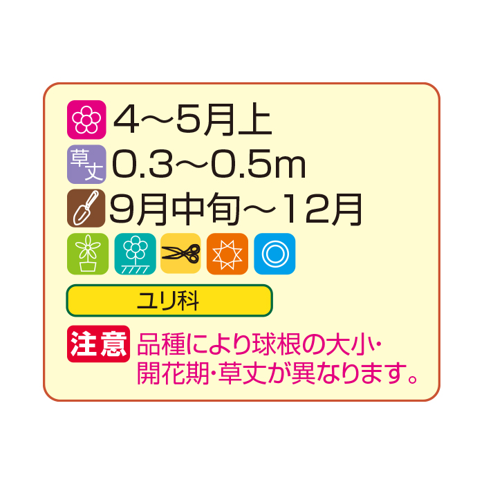 商品の仕様 ◎紅美人、黄小町、白雪姫、紫水晶、桃太郎 各10球 ◎日本の気候の中で生まれた品種なので、育てやすく花色・形ともお奨めです。翌年の球根も比較的残りやすく、丈夫さがポイント。 ◎生産国/日本※ 商品のお届けはご注文後、約2週間前後となります。 10105150