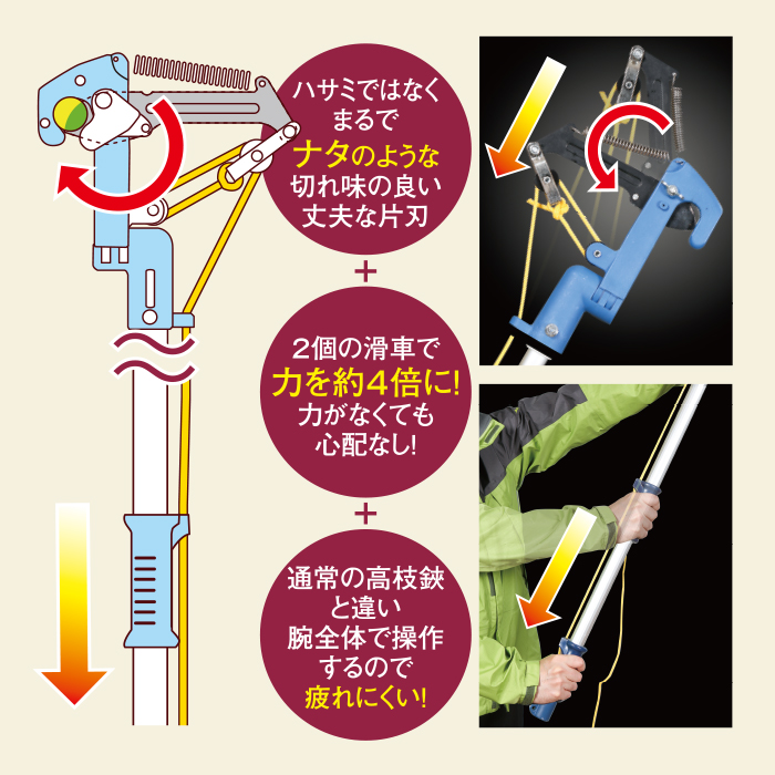 ★滑車の力を使い、最大太さ25mmまで楽に切断! ★1.6mから3.5mまで無段階に伸縮・固定が可能