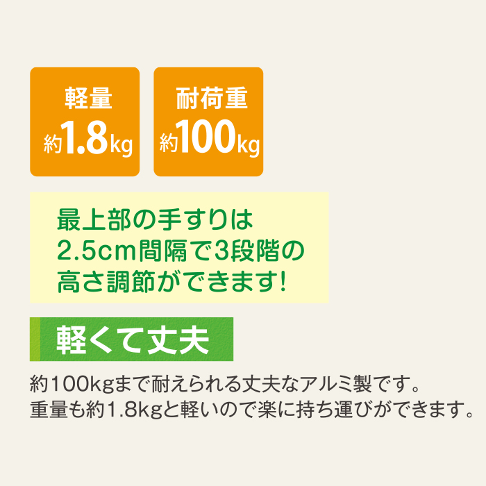 ◎材質:[本体]アルミ(本体)アルミ(エキポシ樹脂粉体塗装)[手すりクッション]EVA樹脂