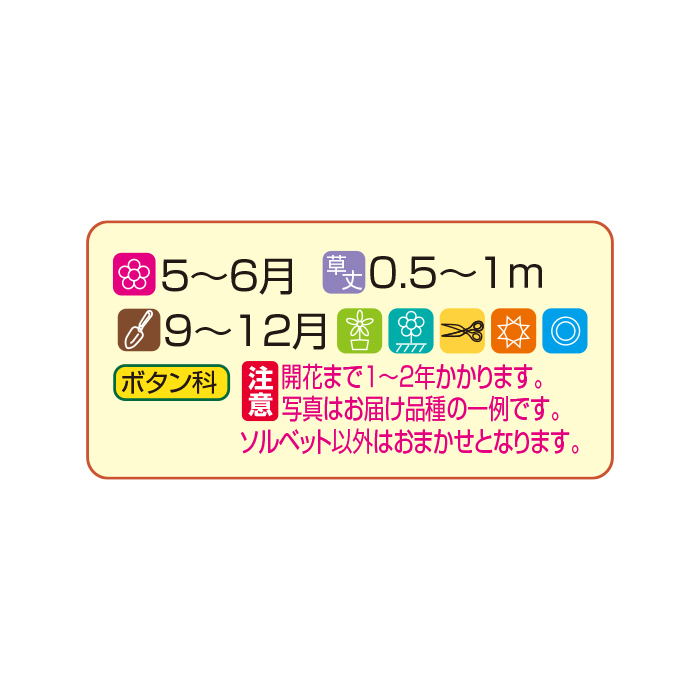 商品の仕様 ◎生産国/日本・オランダ ◎ソルベットを含む品種おまかせ 3種各1株 ◎うっとりするような豪華で美しい花姿。洋風のお庭にもよく似合う、豪華絢爛な芍薬を品種おまかせでお届けします。 ※ 商品の返品・交換はお受けできません。※ 商品のお届けはご注文後、約2週間前後となります。 10111710