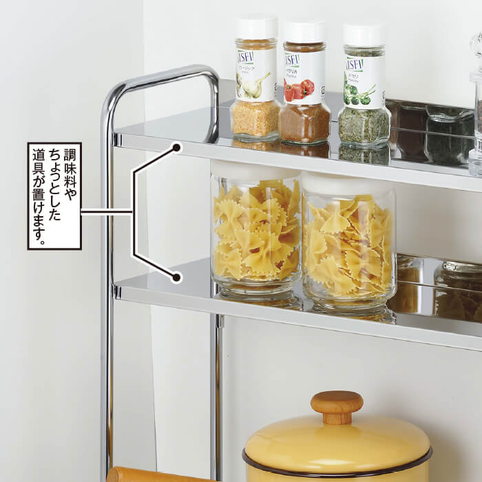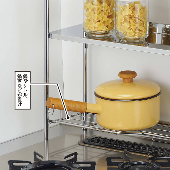 デッドスペースになりがちなコンロ奥を収納に活用。底板がなく、コンロの排気口を防がない設計です