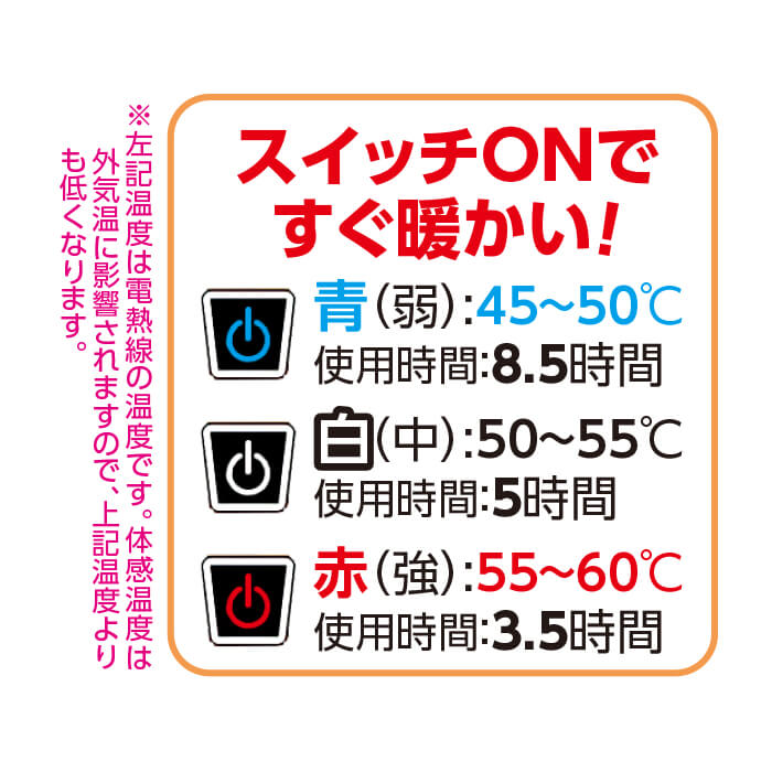 ◎本体素材:外側/撥水ポリエステル+ポリウレタン、内側:フリース、発熱部/複合繊維発熱体