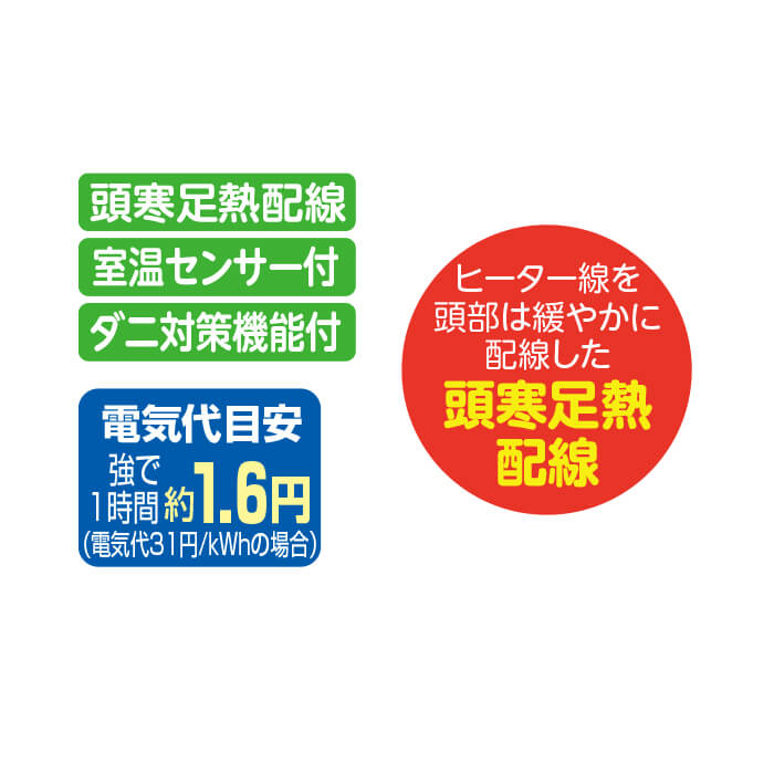 商品の仕様 ◎サイズ(約cm):約130×188 ◎材質: たて糸/ポリエステル100%、よこ糸/ポリエステル70%・アクリル30% ◎コード:電源側/約1.9m、本体側/約1.2m ◎電源:AC100V ◎消費電力:80W ◎日本製 ※洗濯機は「手洗いコース」で設定してください。※ドラム式洗濯機使用不可 10125209