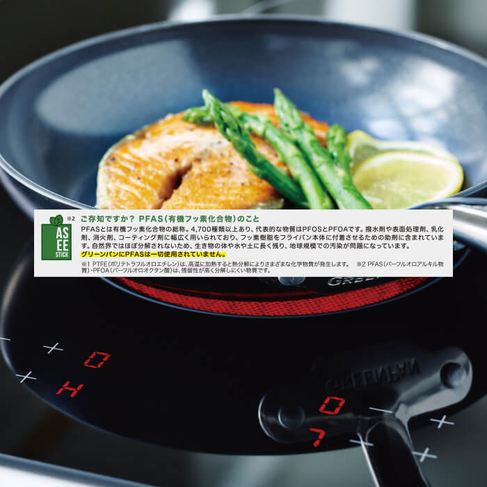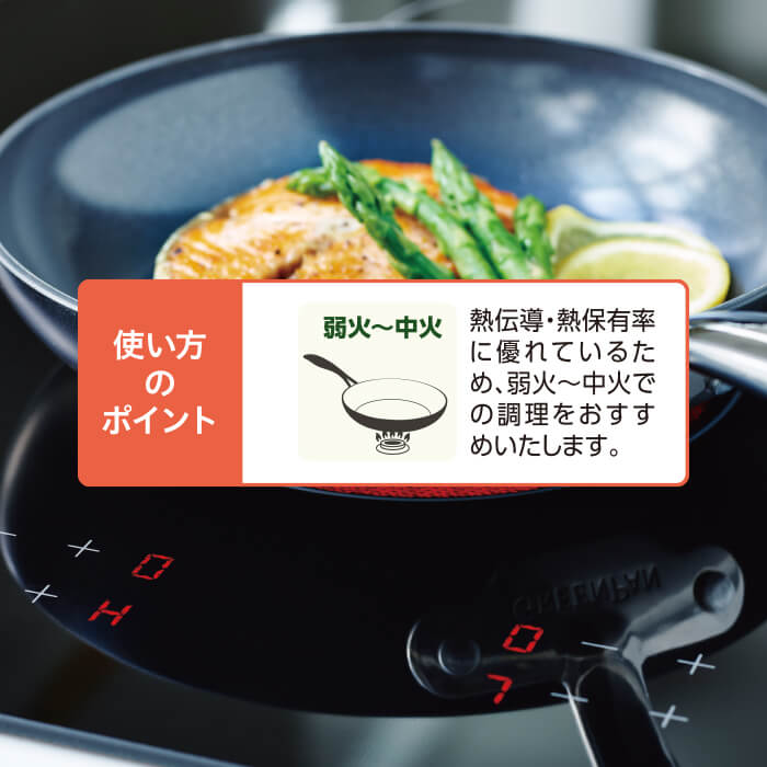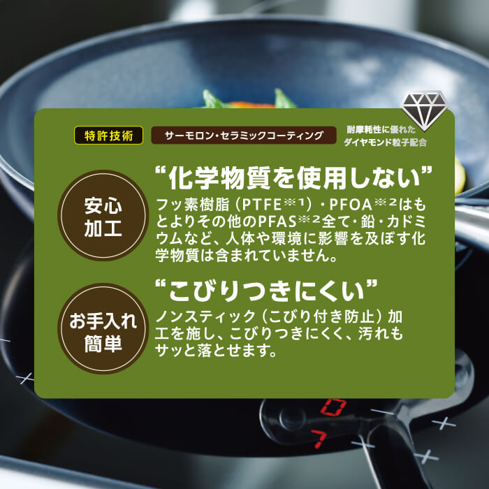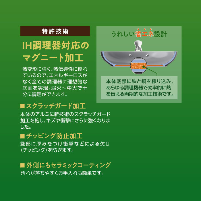 ◎本体:アルミニウム合金、底面:金属溶射構造、ハンドル:ステンレス鋼、蓋:強化ガラス(全面物理強化)、ステンレス鋼