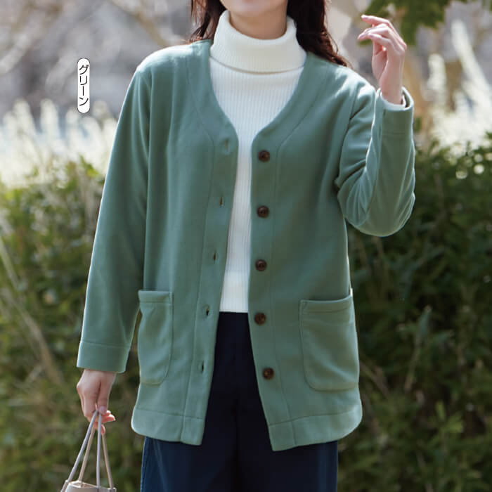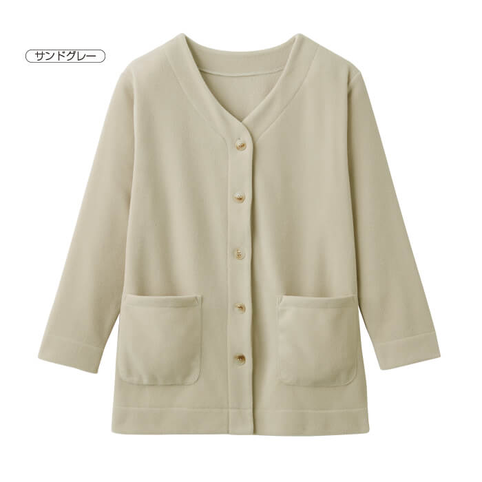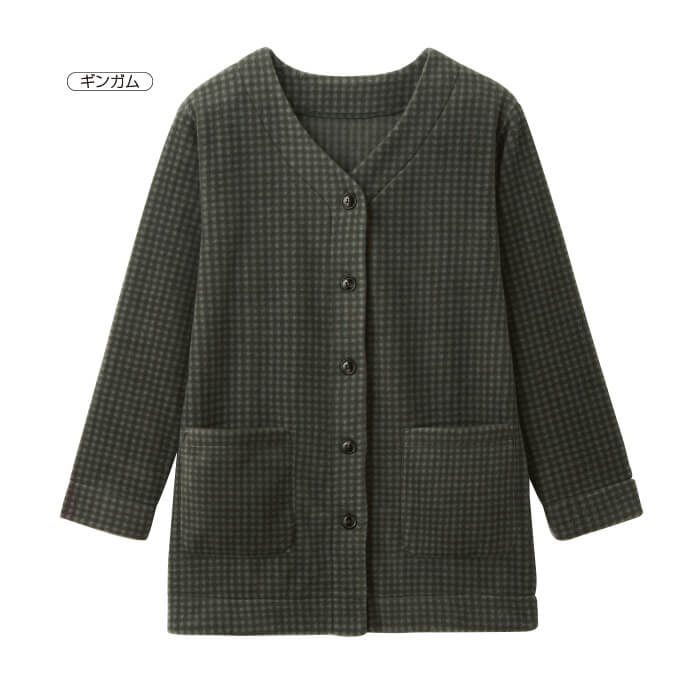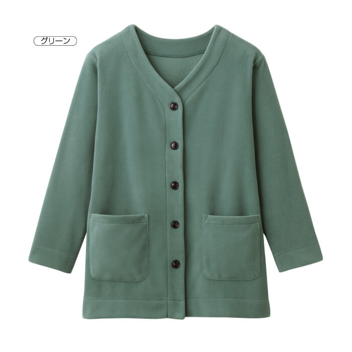◎前ボタン全開(5個)、左右ポケット、Vネック仕様