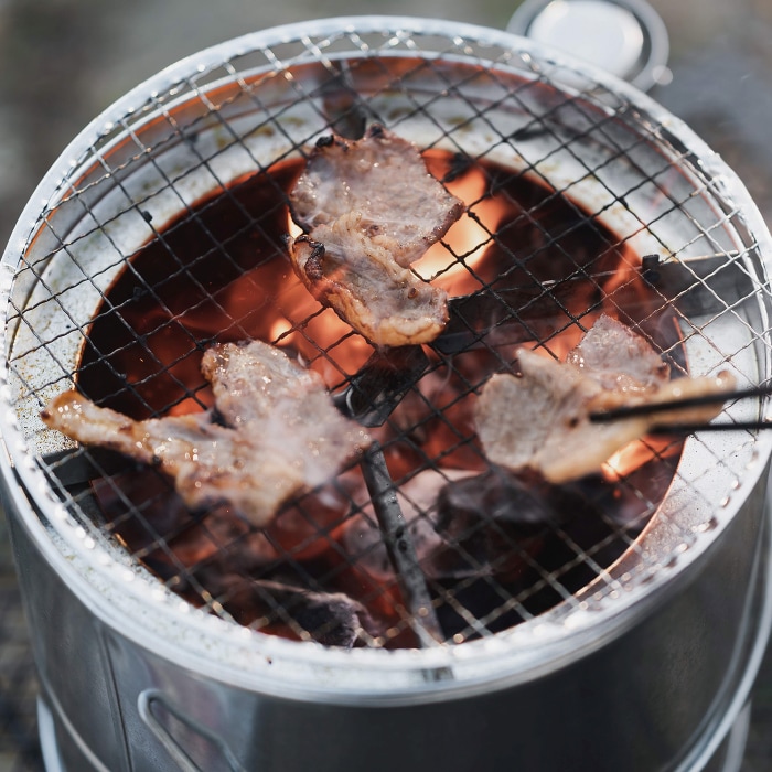 ◎サイズ(約cm):幅25×奥行25×高さ24(網直径24) ◎重さ:約1.5kg ◎材質:本体・フタ・五徳・中子/亜鉛メッキ鋼板、網/鉄(ユニクロメッキ) ◎日本製