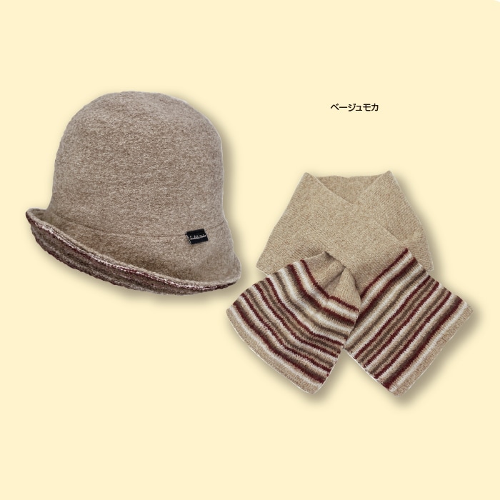 帽子は無地とボーダー柄のリバーシブル。プチマフラーは穴に差し込むだけで簡単にスタイリングが完成。