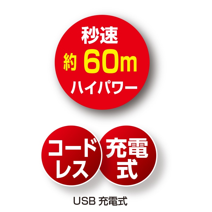 ◎仕様:風速(LOW)約20m/s (MID)約40m/s (HIGH)約60m/s ※標準ノズル取付け時/使用環境温度5〜40℃/ケーブル長約 0.9m(付属 USB ケーブル)