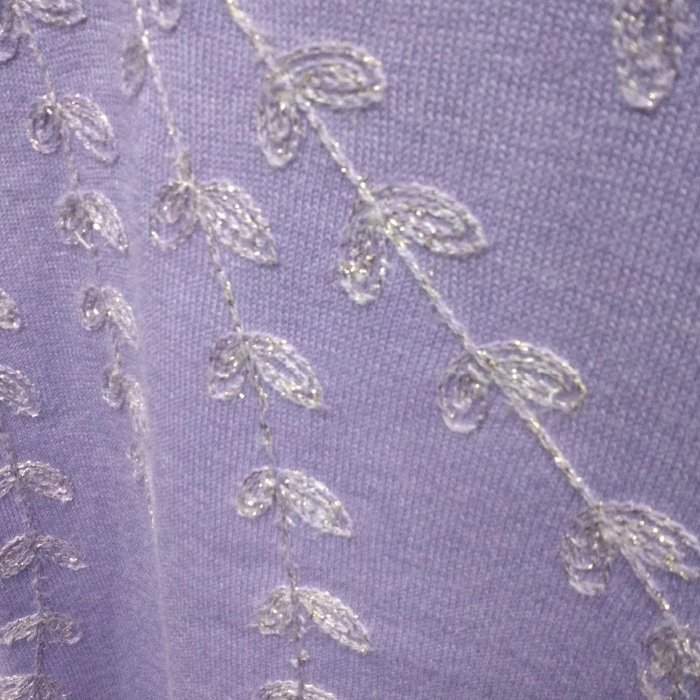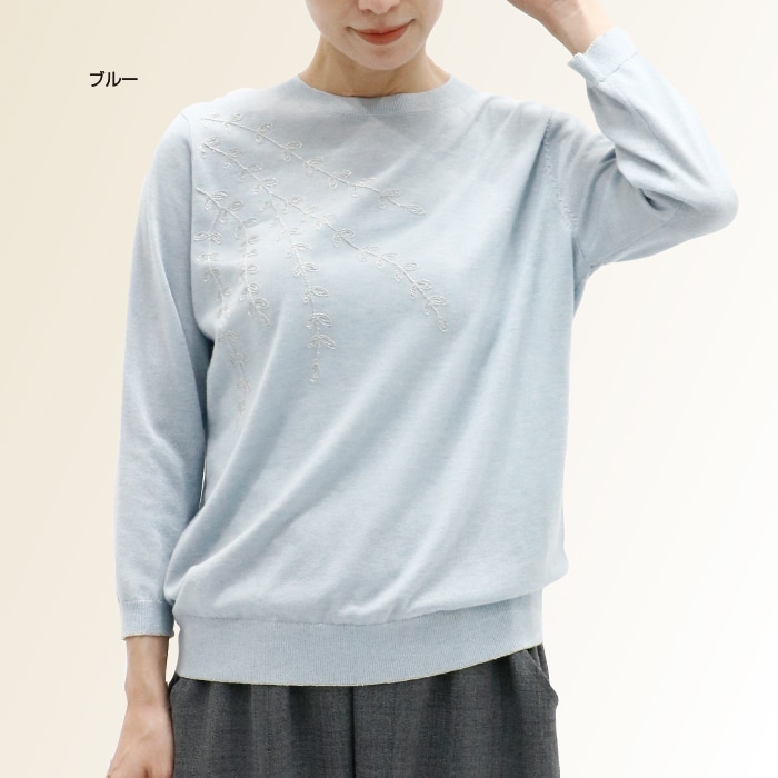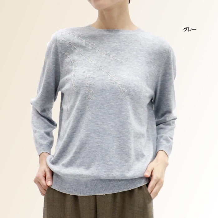 胸元に施されたさりげないラメ刺繍が、シンプルなデザインの中に上品なきらめきをプラス。
