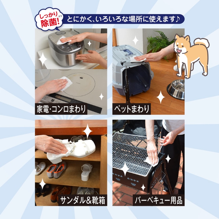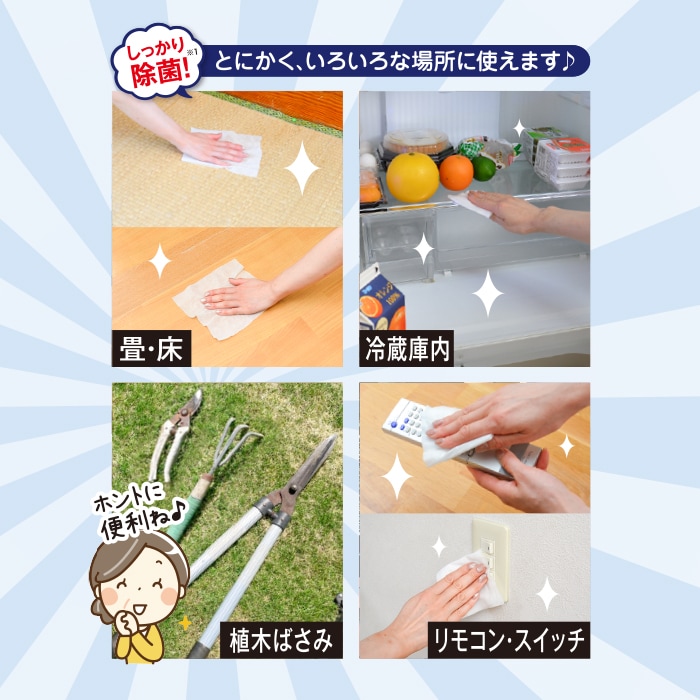 ※1.身の周りのモノの除菌。また、全ての菌を除菌するわけではありません。※2.目や粘膜および傷口には使用しない。*アルコール過敏症の方や乳幼児には使用しない。