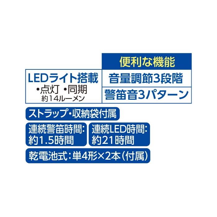 ※本機は大音量警笛音を発しますので、お試しの際は周囲を確認の上、警笛発生部を手で軽く押さえながらお試しください。 ※決して耳に近づけて聞かないでください。また人に向けて使用しないで下さい。鼓膜を痛める可能性があります。 ※本品はスポーツ競技用のホイッスルとして、あるいは大音量で相手を威嚇するためのもので、獣や犯罪を完全に防止するものではありません。