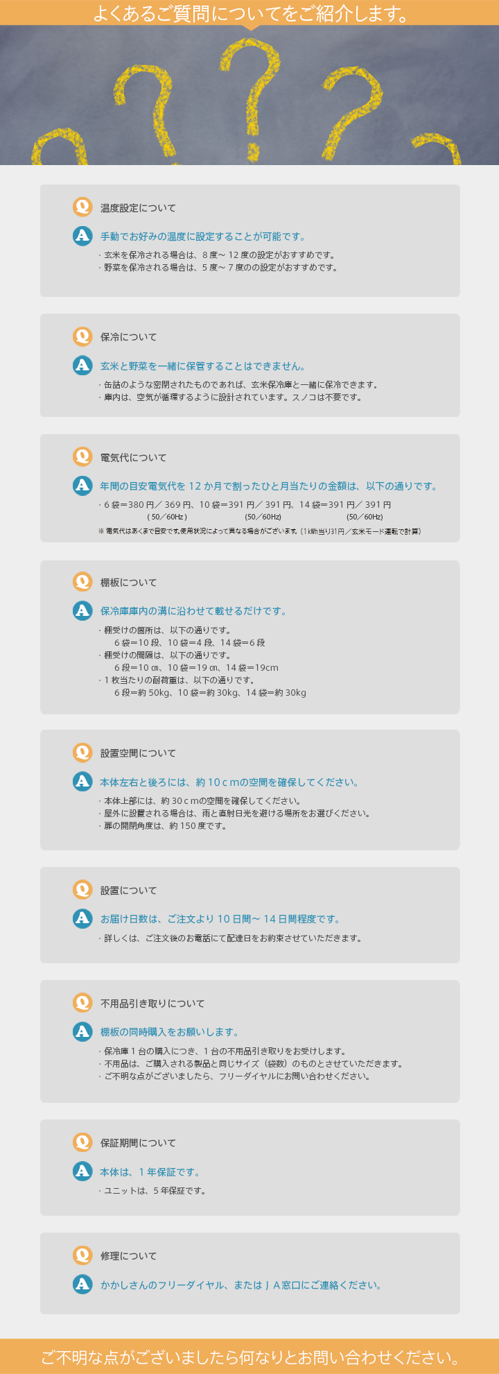 ●外気温が低い場合は設定温度以下になり、運転を自動で停止する場合があります。●家庭用冷蔵庫より動作音が響く場合があります。●電気代はあくまで目安です。使用状況によって異なる場合がございます。(1kWh当り31円/玄米モード運転で計算)●米袋のタイプによっては収納しにくい場合がありますので、米袋のサイズと保冷庫内寸を事前にご確認ください。●設置場所には米袋を含め数百kg以上の荷重がかかります。しっかりした床に設置してください。